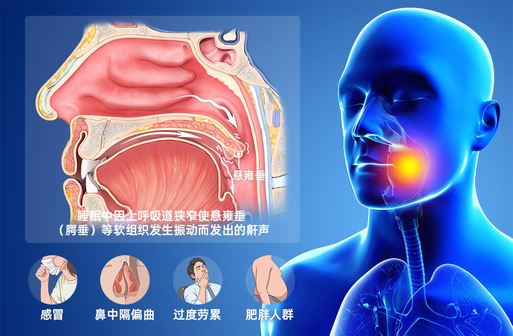 口腔、鼻腔、咽喉等处病变,如气道先天发育异常、感冒、鼻炎(过敏性鼻炎、萎缩性鼻炎、药物性鼻炎、急性鼻炎、慢性鼻炎)、鼻窦炎、鼻窦囊肿、鼻息肉、腺样体肥大、鼻中隔偏曲、鼻甲肥大、鼻部肿瘤、扁桃体炎、扁桃体肥大、软腭松弛、悬雍垂过长或过粗、咽部肿瘤、舌体肥大、舌根后坠等,这些疾病会造成鼻、咽、喉处气道狭窄,导致气流不畅,引起睡眠打鼾。