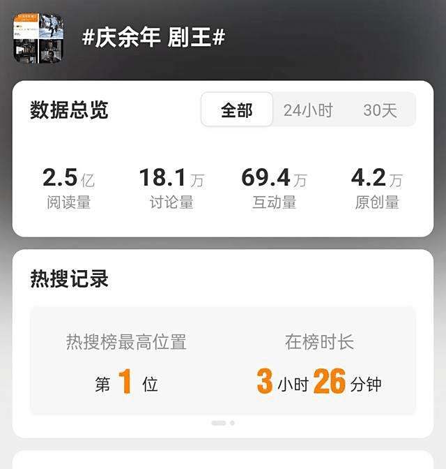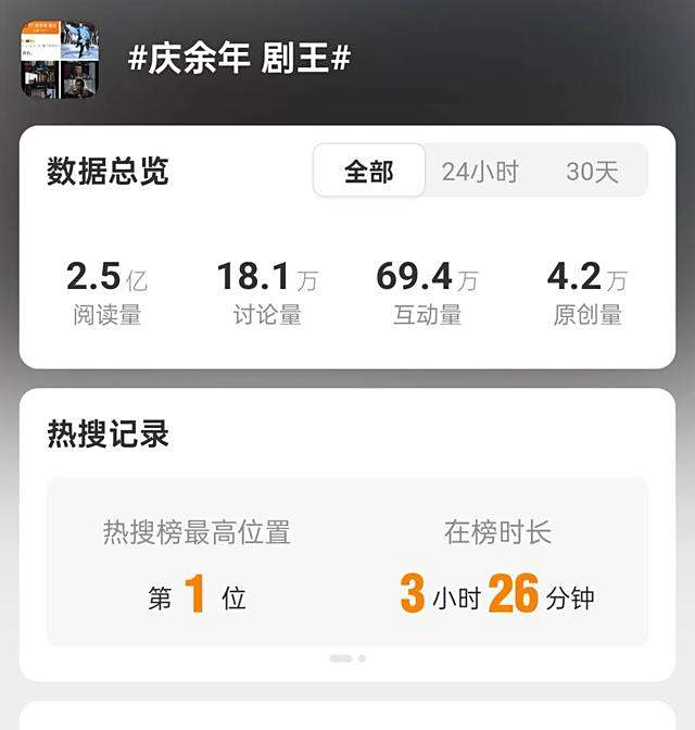 2024年5月16日,《庆余年第二季》开播后,126分钟热度破32000。热搜榜前十独占7位,话题#庆余年 剧王#登顶Top1,截至2024年5月16日 23:56,该话题阅读量2.5亿,互动量69.4万。截止到5月29日,《庆余年2》播出的总广告数为174个,品牌23个,单集最高9个广告,集均广告数量8.2个。
