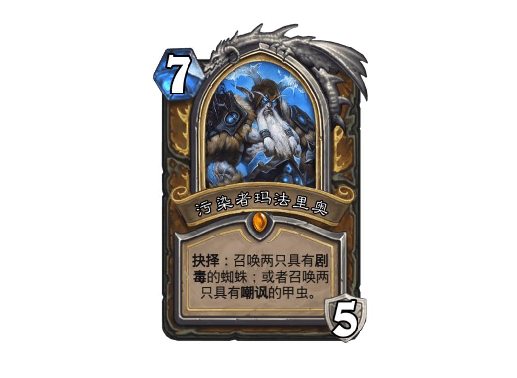 这张dk给其它职业可能是一张平庸的卡,但给了德鲁伊就是一张很强的牌。因为跳费体系,别人4费5费时已经是一个可以两费打三的污染者玛法里奥了,既可以解场也可以咬脸补充伤害。退一步说这是一张让奥秘法绝望的单卡,可攻可守的特点让他很契合蓝龙德的构筑。3