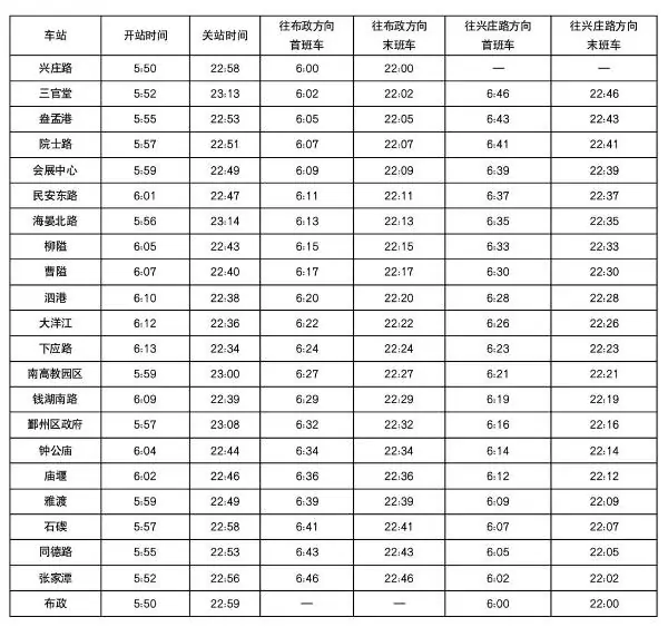 据2021年12月29日宁波轨道交通官网显示,宁波轨道交通5号线各站点的首末班车时刻如下。(仅供参考,最新信息请以车站公示或宁波轨道交通集团官网→等官方信息发布渠道为准)