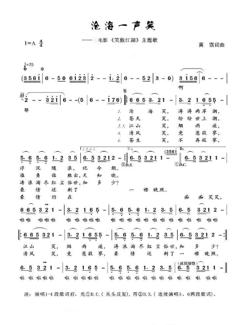 沧海一声笑 滔滔两岸潮 浮沉随浪 只记今朝 苍天笑 纷纷世上潮 谁负谁胜出 天知晓 江山笑 烟雨遥 涛浪淘尽红尘俗世几多娇 清风笑 竟惹寂寥 豪情还剩了一襟晚照 苍生笑 不再寂寥 豪情仍在痴痴笑笑 啦…… | 沧海笑 滔滔两岸潮 浮沉随浪记今朝 苍天笑 纷纷世上潮 谁负谁胜出 天知晓 江山笑 烟雨遥 涛浪淘尽红尘俗世知多少 清风笑 竟惹寂寥 豪情还剩了一襟晚照 苍生笑 不再寂寥 豪情仍在痴痴笑笑 啦…… |