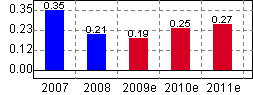 深康佳A当前分析师一致预计其2009年、2010年、2011年EPS分别为0.26元、0.33元及0.38元,当期一致预期较前1个月下调-8.65%;
