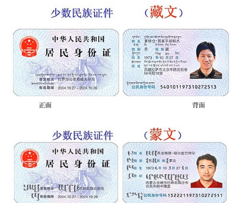 根据《中华人民共和国居民身份证法·第一章·第四条·第二款项》,“民族自治地方的自治机关根据本地区的实际情况,对居民身份证用汉字登记的内容,可以决定同时使用实行区域自治的民族的文字或者选用一种当地通用的文字。”允许中国少数民族地区使用相应的主体少数民族文字的民汉双文身份证,如广西签发的第一代、第二代身份证都有壮文。第一代民族文字因技术原因采用手写,第二代六种民族文字全部采用计算机输入。中国第二代身份证有壮文、维文、彝文、藏文、蒙文、朝鲜文六种民族文字与汉文字并列的双文版身份证。使用以上六种民族文字的少数民族地区的共有资料部分一律为民族文在上(蒙文在汉文之左则)、汉文在下双文版本。本人资料部分少数民族地区的主体少数民族居民可以申请附加民族语言在汉文之上,汉族以及其他民族居民则只显示汉文。即:新疆维吾尔自治区全区的身份证的共有资料部分一律为维汉双文版本(例:姓名نامى),而区内的维吾尔族居民可以在本人资料部分的汉文之上附加维吾尔文(例:纳斯尔丁·阿凡提نەسىرىدىنئەپەندى),而区内的汉族或其他少数民族的本人资料部分则只有汉文,或也可申请附加维吾尔文,但不能附加其他的民族文字(如哈萨克文、蒙古文、锡伯文等)。