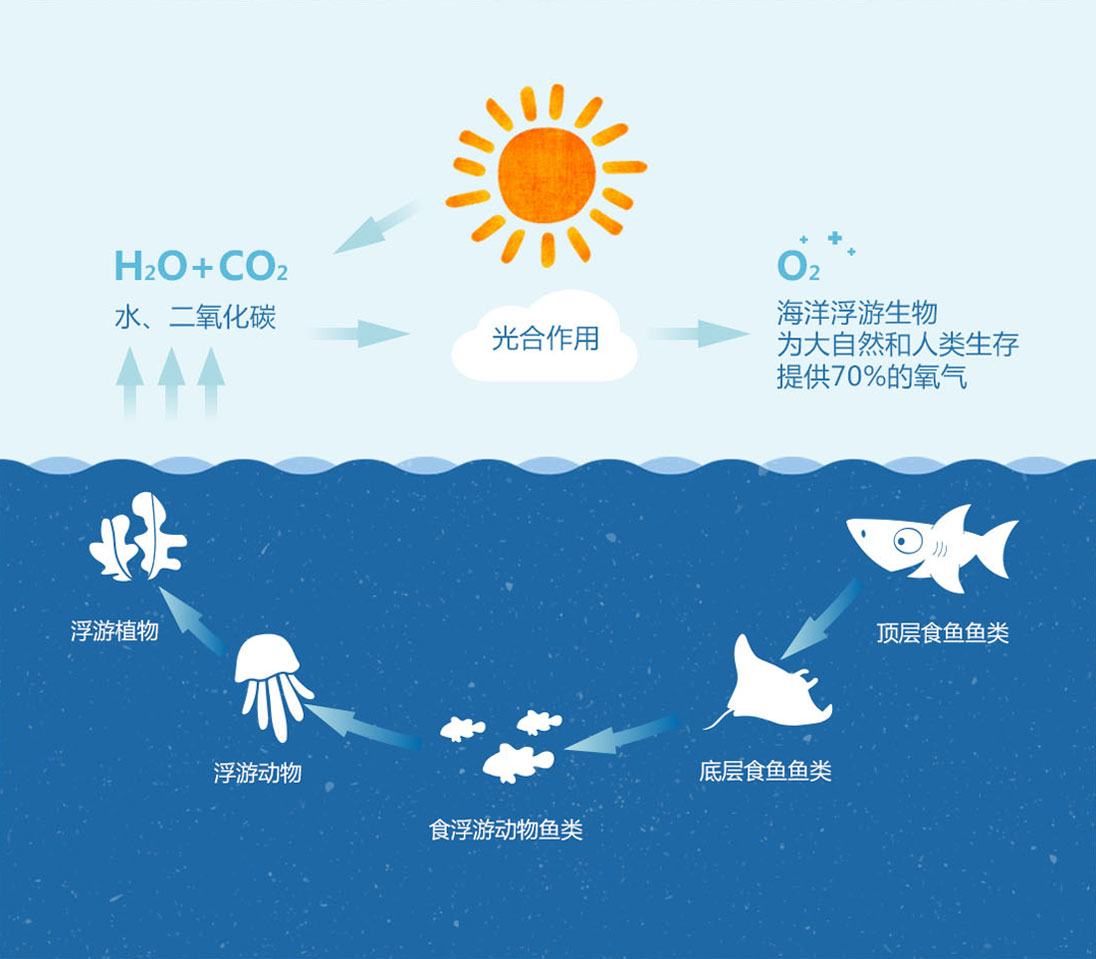 浮游生物是在海洋一定水层中营漂浮生活的动、植物的统称。这一类群生物个体都很小(除水母等外),游泳能力微弱,随波逐流。浮游生物的种类很多,数量很大,分布也相当广泛。在动物性浮游生物中,从原生动物到脊椎动物几乎各类都有,形体相对较大,其中以甲壳类和软体动物最重要。植物性浮游生物比动物性浮游生物种类少,只有隐花植物中藻类的一部分,如硅藻类、绿藻类和蓝藻类等。浮游生物是海洋食物链的基础,是鱼类、哺乳类(如须鲸)及其他海洋动物的天然饵料。有些浮游动物如毛虾、海蜇可供食用,有经济意义;有些种类如夜光藻、蓝藻、双鞭藻等大量繁殖,能形成赤潮,使水质变坏,破坏生物资源。有些浮游生物具有富集放射性物质、重金属和农药的能力,可以作为监测海洋污染的指示生物。