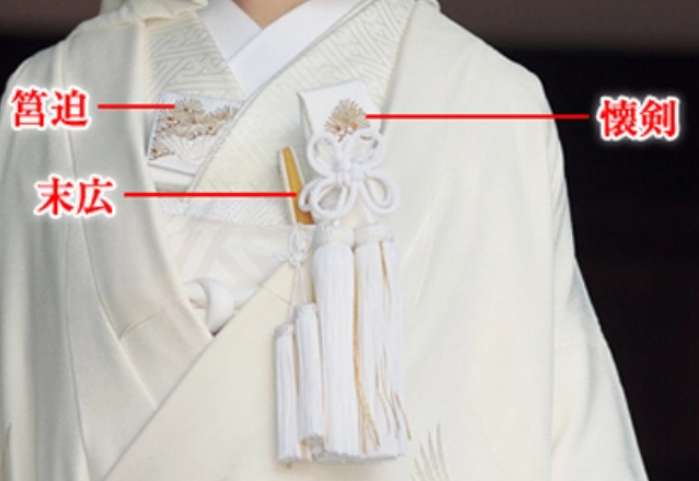 怀剑原为武士佩戴的匕首,在白无垢套装中,仅做装饰用;花边,为白无垢褂下胸前部分的装饰;末广,折扇的别名,是用于庆祝的物件。
