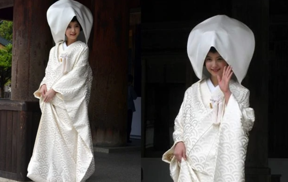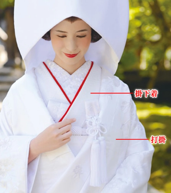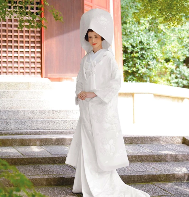 白棉帽,原为江户时代女性外出防寒服饰,有在婚礼结束前除新郎外不让其他人看到新娘容貌的意思,也有不给新郎家带去新娘头发中隐藏的“灵力”,除灾祸的意思。