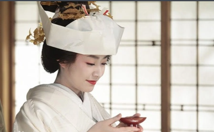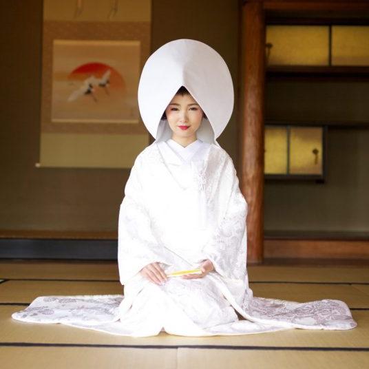 传统的白无垢造型以“角隐”和“白棉帽”为头饰。
