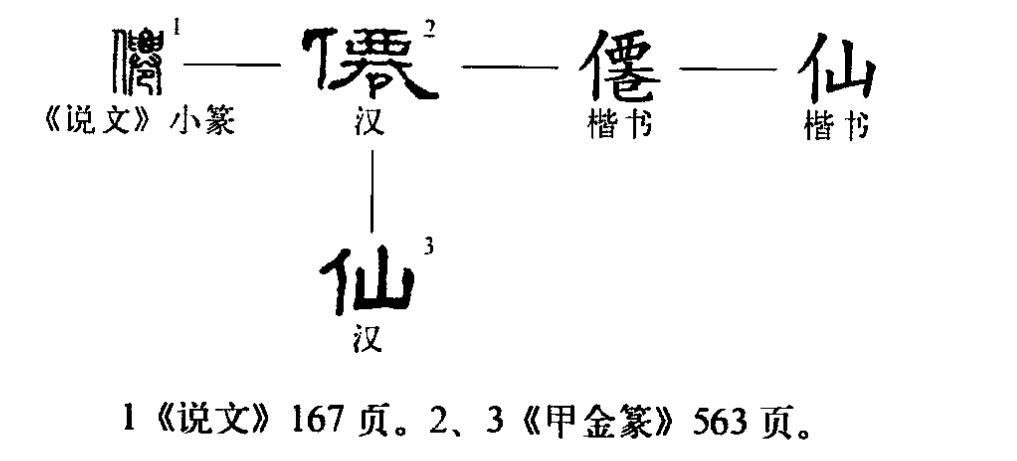 仙,会意兼形声字。从人,从䙴,䙴亦声。篆文“图1”由“人”、四只手把东西举起来的示意图和坐着的人形构成。后两个字符合在一起表示人看见一个东西升起来了,整个字的意思是升入天空中的人,由此产生神仙的含义。本义指长生不老,升天而去。《说文》:“仙,长生仙去。”其字汉代或从人、从山,清段玉裁《说文解字注》引《释名》:“老而不死曰仙。仙,迁也,迁入山也。故其制字人旁作山也。“