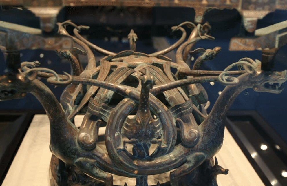 上世纪70年代,中山国的王陵被发掘后,绚烂的中山国终于呈现在考古学家面前了。雄伟的城墙,夯土厚度50多米,突显出中山国的辉煌繁盛。宏大的“山”字形大墓、豪华的车马坑、新奇的葬船坑、华美的青铜器……出土的器物繁多华美奇崛,令世人震惊不已。虽然在当时7个“万乘之国”各建霸业的局面中,中山这个夹在燕赵之间、东西只有500多里的国家,只是一个“千乘之国”的小国,然而它却在其两百多年的历史中,创造了堪称“中华辉煌”的灿烂文化。比如构思拙朴、结体宏大的山字形礼器,显示出中山文化的粗犷线条。奇想巧变、设幻诡异的错金银“四龙四凤方案”、“虎噬鹿屏风座”、“双翼神兽”、“犀牛器座”等闪烁着铸造工艺的炫目华美。最令人惊喜的是“中山王三器”——大铜鼎、方壶、圆壶,上面刻满了长篇铭文,让今人看到了严整规矩、悠长秀丽、刀法洗炼的战国文字,其中铁足大铜鼎上刻铭469字,是国内已发现的战国时期字数最多的一篇铭文。