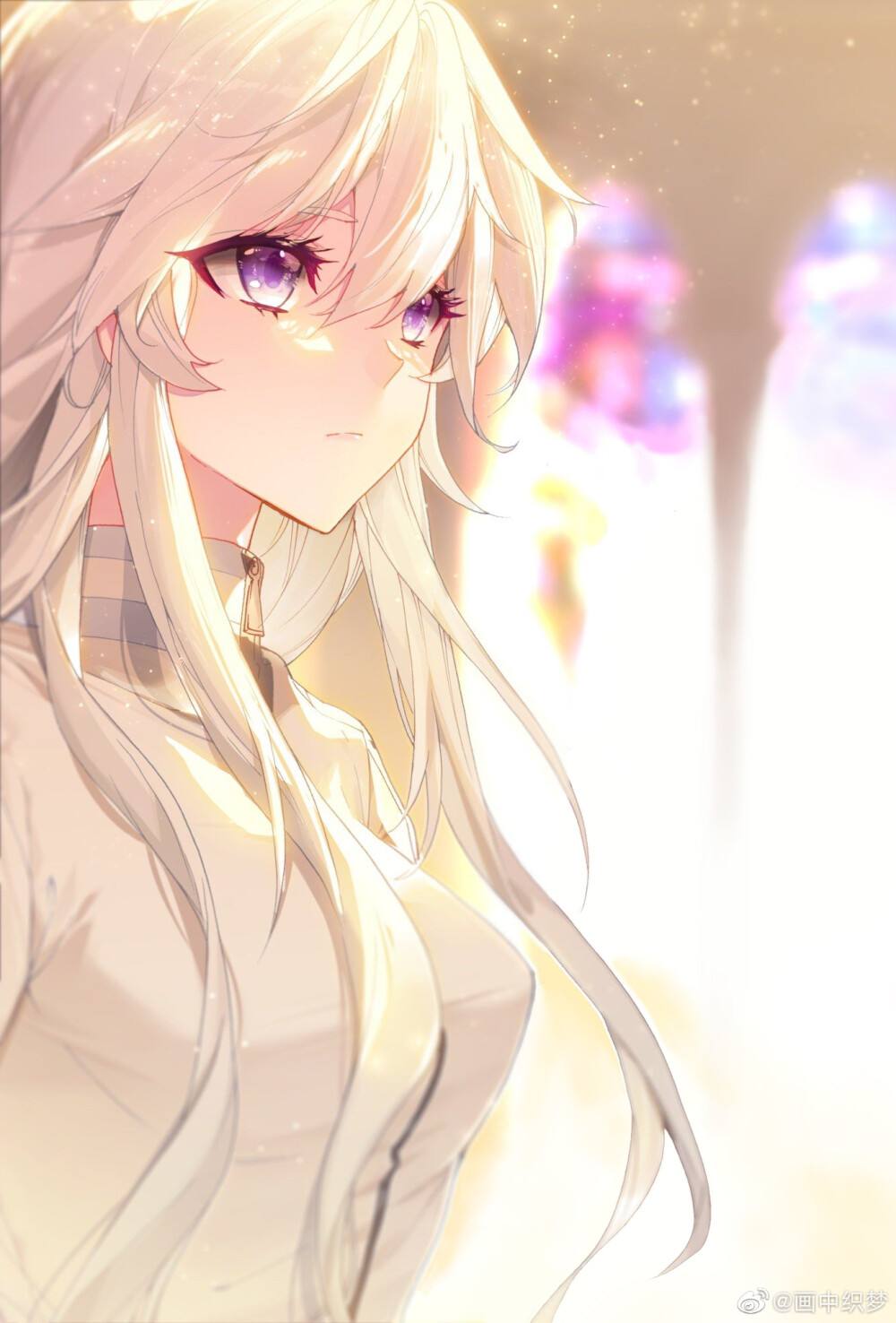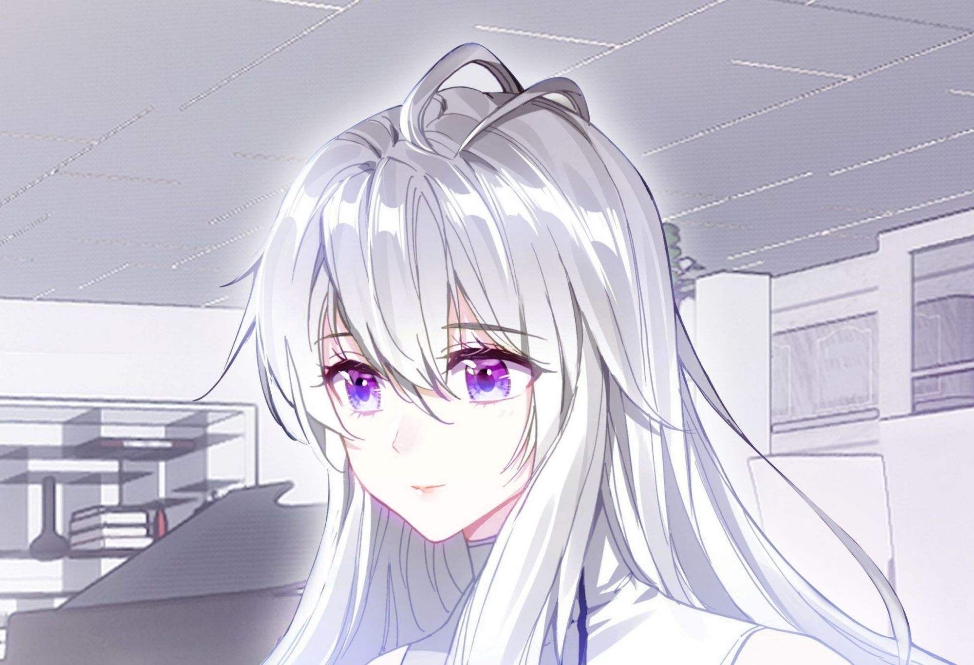 一头银白色长发披散于后背,刘海微及眼部,瞳孔如紫水晶一般明亮,服装大部分以白衣为主。