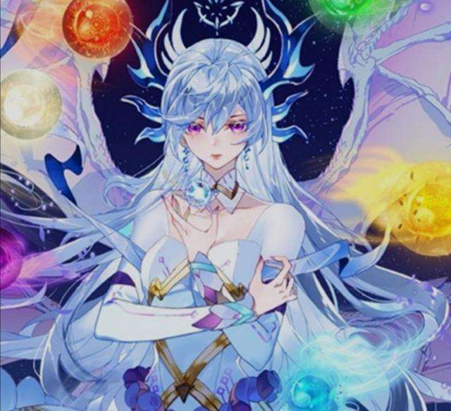 SSR:一头银白色长发,配有白色羽毛发饰,紫色瞳孔身着以白色与紫色为主色的连衣裙,白色过膝长袜,足底一对紫黑色高跟鞋,背后有一对银色龙翼,周身环绕着七元素光球。