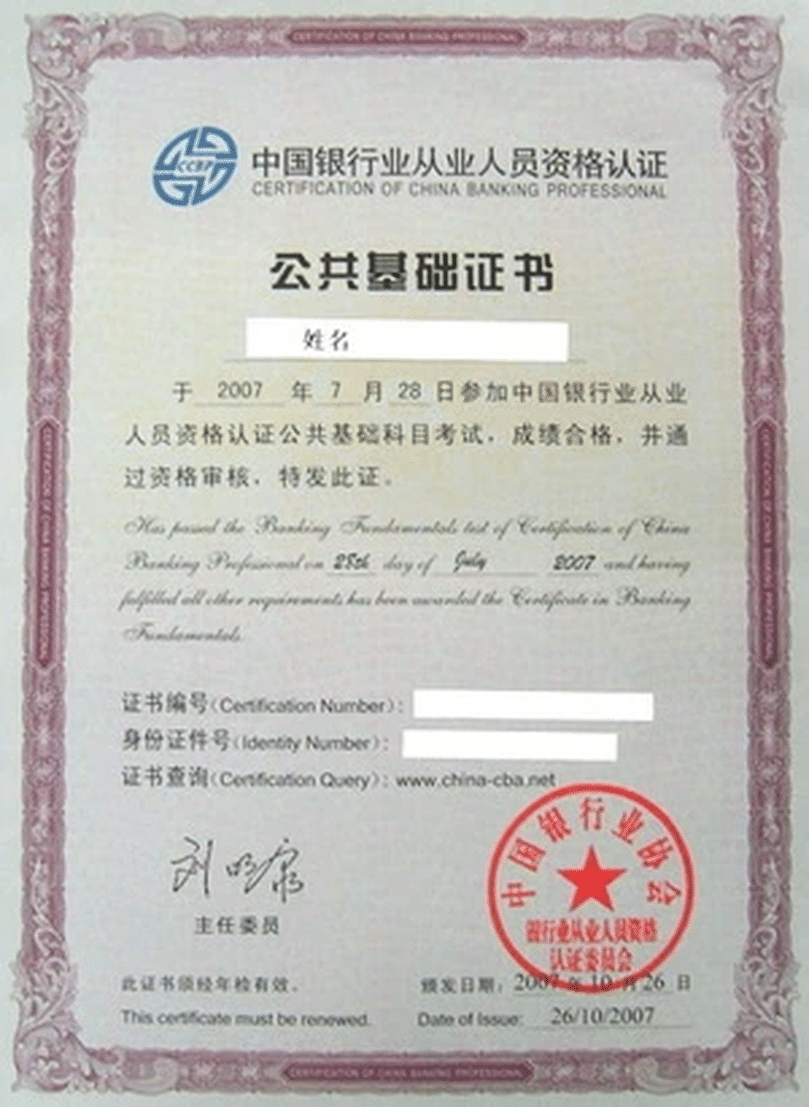 中国银行业从业人员资格证书为“1+N”的证书模式,即一门公共基础证书+N个专业证书。