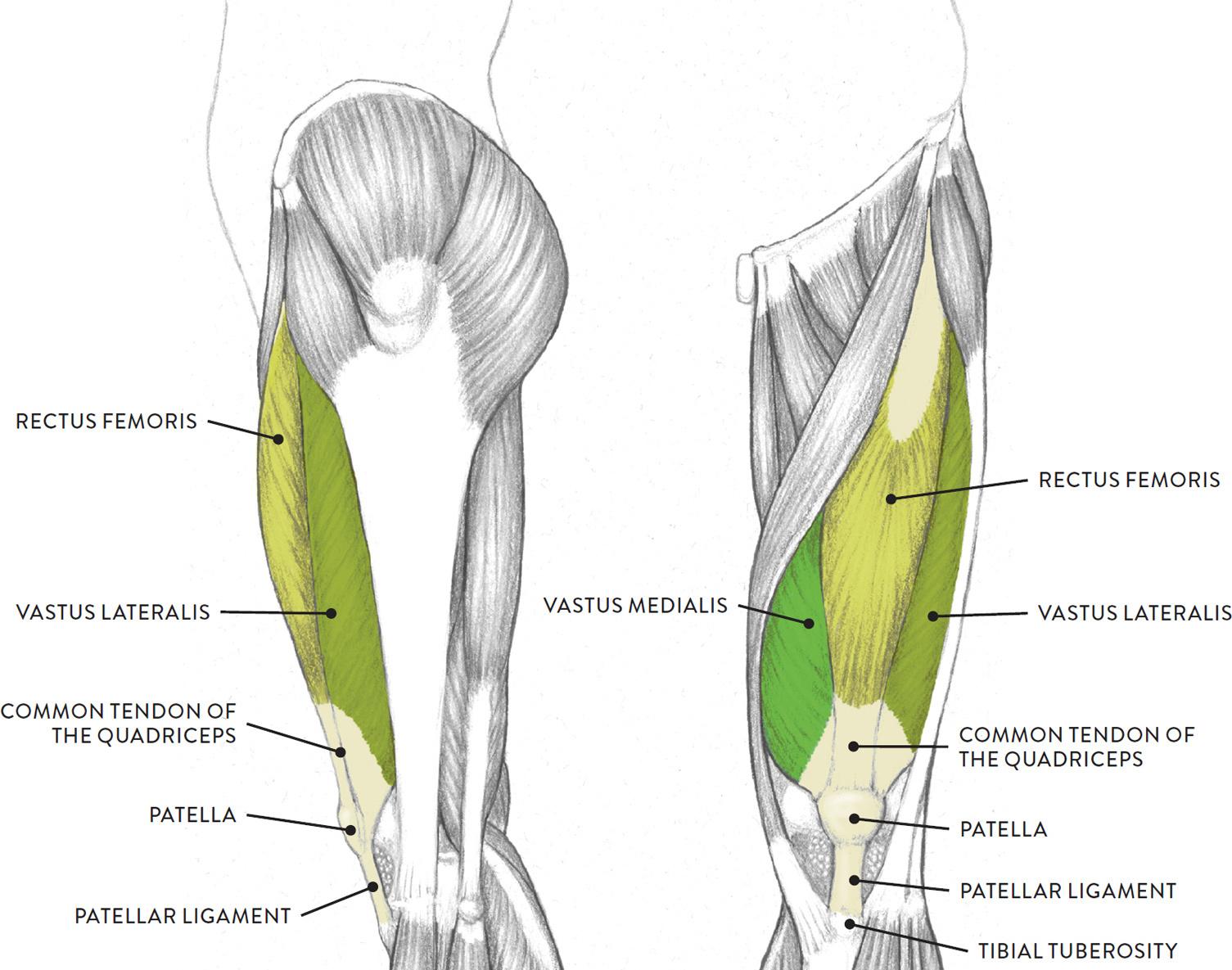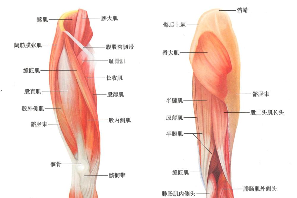 股四头肌是全身中体积最大的肌,有4个头:股直肌、股内侧肌、股外侧肌和股中间肌。股直肌位于大腿前面,起自髂前下棘;股内侧肌和股外侧肌分别起自股骨粗线内、外侧唇;股中间肌位于股直肌的深面,在股内、外侧肌之间,4个头向下形成一个腱,包绕髌骨的前面和两侧,继而下延为髌韧带,止于胫骨粗隆。