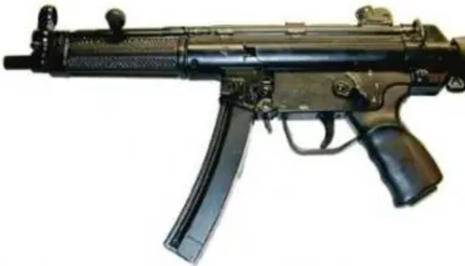 HK-MP5 1970年,HK公司推出了MP5的新改型MP5A2和MP5A3。外形上,MP5A2和A3与MP5和MP5A1一样,只是在枪管的安装方法作了改良,采用了浮置式枪管,即枪管不再用前后两点固定的方式,仅安装在机匣前端而形成浮置状态。枪管长225毫米,6条右旋膛线,枪口动能为650焦耳。表尺射程为200米、300米和400米。 MP5A2和A3具有基本相同的结构,两者的区别只在于MP5A2安装固定式塑料枪托,MP5A3则为伸缩式金属枪托。最初的MP5A2、A3使用直型弹匣,到1977年全部改为弧型弹匣。在1985年HK公司推出MP5A4和A5以后,由于其大型塑料护木使用起来相当舒适,因此很多原来的MP5A2、A3的用户都纷纷购买塑料护木安装在MP5A2、A3上。 20世纪80年代,突击步枪开始流行3发点射的功能。于是在1985年,HK公司也推出了有3发点射功能的MP5新改型——MP5A4和MP5A5。与MP5A2和A3相比,MP5A4、A5主要的改进是内装3发点射机构和塑料制的护木。MP5A4和A5的区别与A2和A3一样,分别为固定式枪托和伸缩式枪托。 | HK-MP5冲锋枪 |