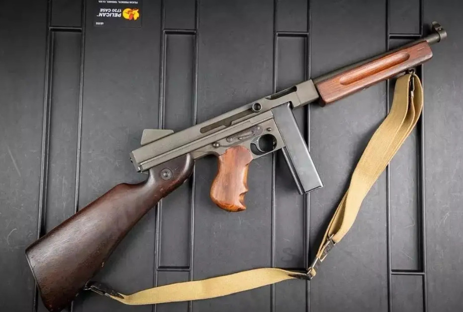 汤普森 第一次世界大战爆发后,汤普森将军的设计小组针对美国远征军勃朗宁自动步枪不适合堑壕和铁丝网间作战的特点,放弃了复杂的导气式结构,转而采用了结构简单、运动部件少的自由枪机结构的自动武器设计。但采用自由枪机结构的自动武器,只能发射装药量少、膛压低的手枪弹。如果使用步枪弹则击发时会发生枪机过早打开、膛压导致弹壳爆裂的故障,因此设计小组最后选用了直弹筒的11.43毫米(0.45英寸)的大威力手枪弹,该弹是汤普森冲锋枪成功的重要秘诀,冲锋枪的早期研制产品是M1919式(代号“毁灭者一号”),它的最早的生产型是M1921式,后来又相继出现了M1923、M1928/M1928A1、M1及M1A1系列。M1921式主要针对民用市场,因其火力威猛、压制力强,曾被美国黑帮大量使用,为予应对,美国邮政系统的保安部门、美国各地警局以及联邦调查局等机构也随之进行了批量装备。汤普森冲锋枪由于开枪的声音嗒嗒嗒地似打字机,还被称为“Chicago Typewriter”,即芝加哥打字机,此外还有芝加哥小提琴(Chicago Violin)等称呼。 | 汤普森冲锋枪 |