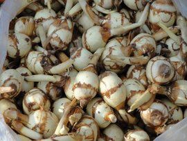 当茨菇地上部分枯死后的10-15天为最佳采收期。采收前10天左右排干田水, 用手抠挖地下球茎。