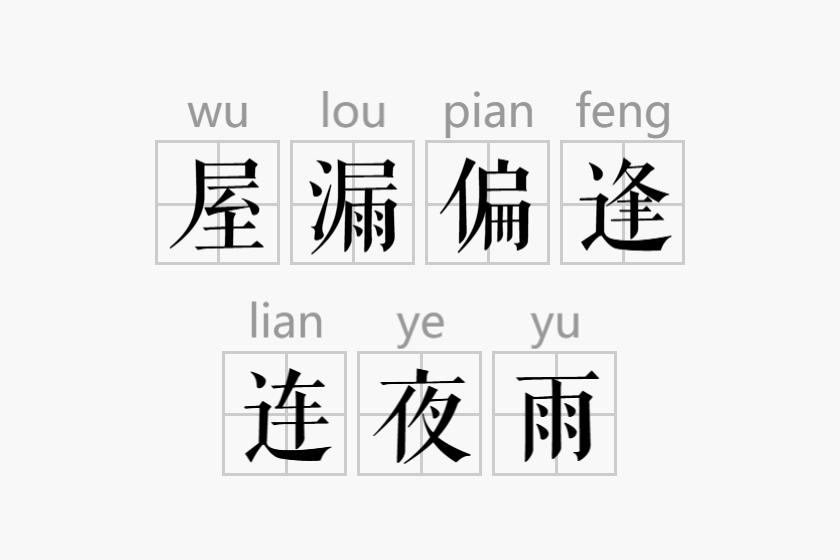 屋子漏了,可是偏偏又赶上连夜下雨。船本来就迟到了,但是又赶上逆风航行。这就是我们常说的祸不单行。引申为本来已经够倒霉的了,但恰巧还有火上浇油的更大的打击。