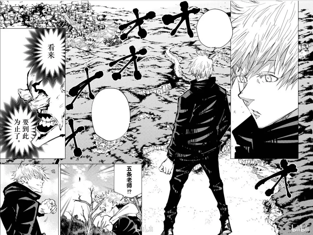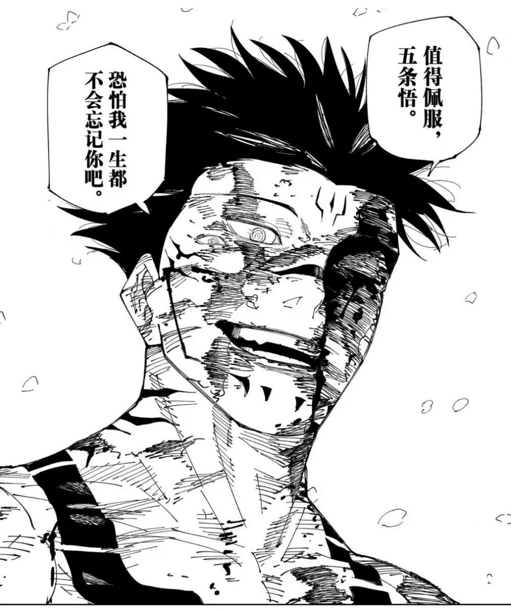 最终宿傩利用【魔虚罗】来适应五条悟的【无限】,而五条悟也利用【黑闪】配合咒术【苍】与术式反转【赫】打伤宿傩,宿傩召唤出【嵌合兽·颚吐】与【魔虚罗】合力进攻五条悟,但最终都被五条悟用虚式「茈」消灭,宿傩自身也身负重伤,在咒术方认为此次战斗是五条悟获胜的同时突然五条悟见到了夏油杰、夜蛾正道、七海建人、灰原雄、天内理子等人,并与大家一起畅谈,随后五条悟表示“我希望这不是我的妄想”但现实中的五条悟已经被宿傩能斩开空间的斩击拦腰斩断,但即便如此五条悟的下半身依然屹立在战场中央。宿傩评价其值得佩服。