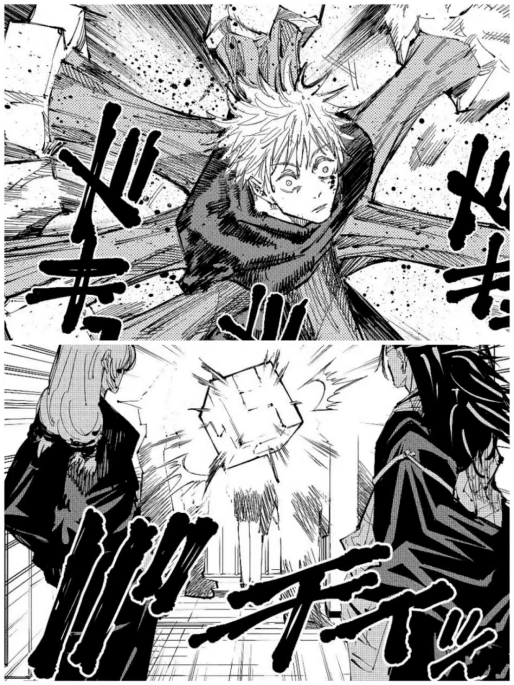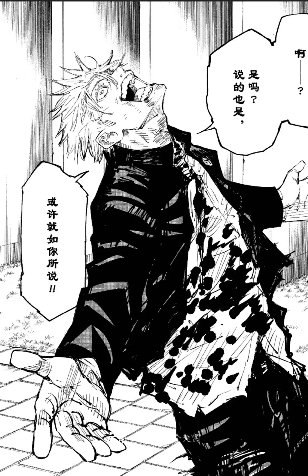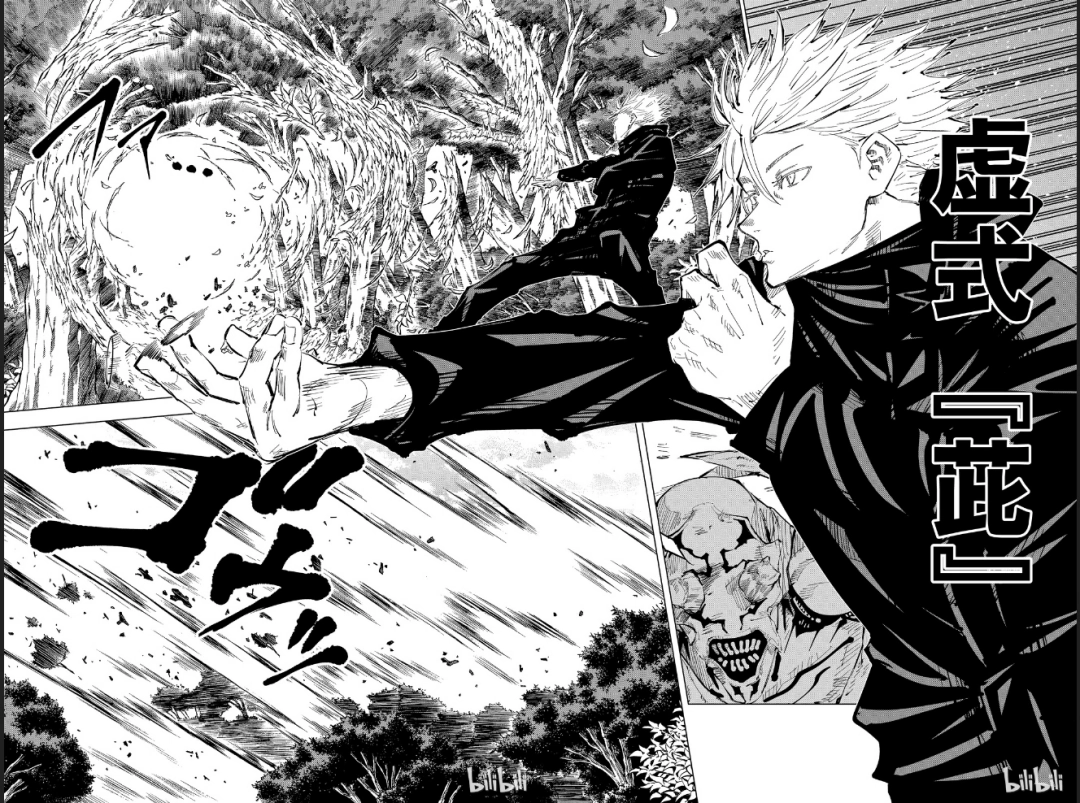 200%的虚式「茈」打碎半条宿傩的手臂,同时五条悟放言“你才是挑战者”,随即两人开打,打斗中宿傩利用【领域展延】意图突破五条悟的【无下限】,与此同时两人同时展开领域,但五条悟的领域却被伏魔御厨子击碎,五条悟一边承受领域内的斩击,一边用【反转术式】治疗伤口的情况下依然可以施展【简易领域】与宿傩势均力敌。