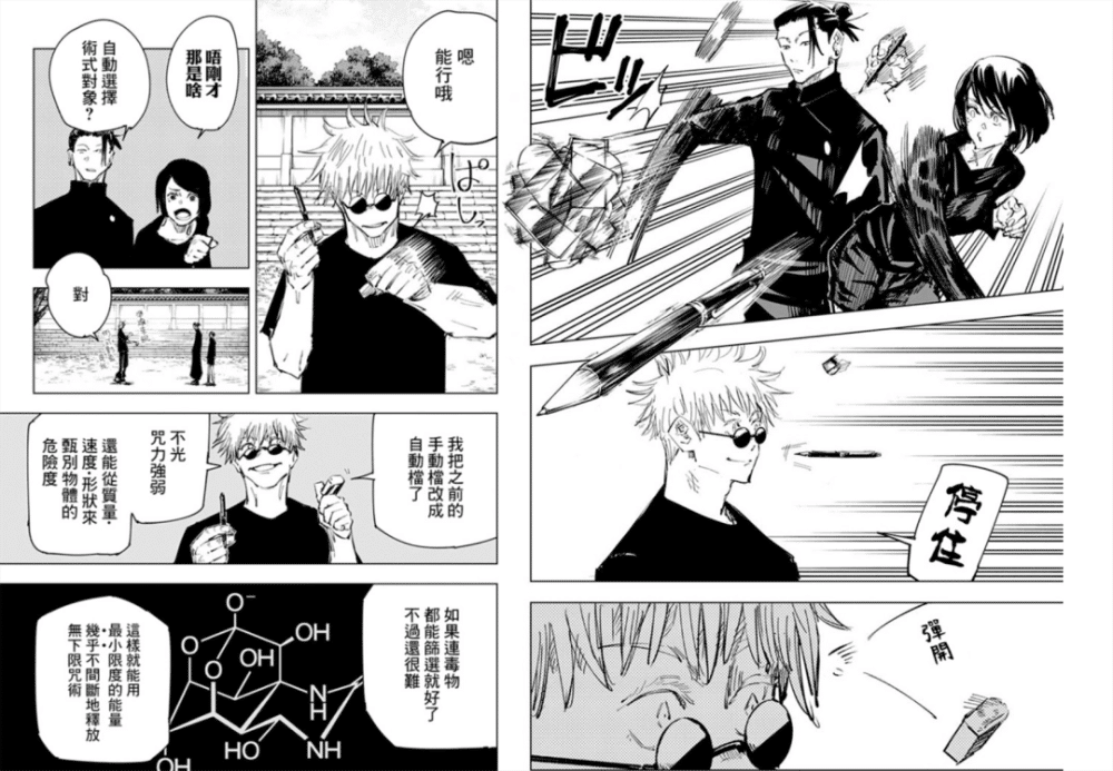 咒术「停止之力」 | 中性的无下限咒术,没有主动攻击性,表现为越靠近五条悟的对象(毒物除外),会变得越慢,仿佛停住一般,在此状态下,任何攻击都无法击中五条悟,只有展开领域才能消除此术影响。击败禅院甚尔一年后,五条悟学会了自动无间断的展开此术式,自动展开的情况下会自动对靠近的对象咒力强弱、质量、速度等进行判断而甄别出危险程度,根据甄别结果会呈现出停止还是弹开。 |