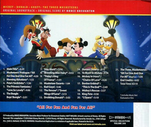 曲目 资料 1、Main Title 2、Musketeers’ Prologue 3、Morning Ablutions 4、Pete’s Yardsticks 5、The Princess Fantasies 6、The Beagle Boys’ Bungle 7、Stay Alert! 8、Wrestling Miss Daisy 9、“Petey’s King Of France” 10、Musketeer Escorts 11、Bad Guys! 12、The Rescue 13、Drubbing Donald 14、Donald Deserts 15、To Mont St-Mickey 16、Mickey In Irons 17、Bovine Unbind 18、Mickey’s Rescue 19 King Pete 20、“L’Opera” 21、The Three, Musketeered 22、End Credits | 发布日期:2018年3月20日 发行地区:北美 ![]() |