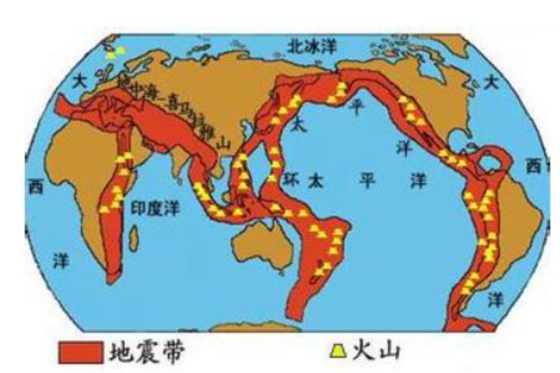 火山地震带,全球有环太平洋地震带和地中海—喜马拉雅山地震带两大地震带,前者约集中了全世界80%以上的浅源地震(0~70千米)、几乎全部的中源(70~300千米)和深源(300~700千米)地震。它围绕着太平洋分布,从南美洲的南端开始,沿西海岸向北延伸,到北美洲阿拉斯加,折向西经阿留申群岛、堪察加半岛、千岛群岛到日本。1
