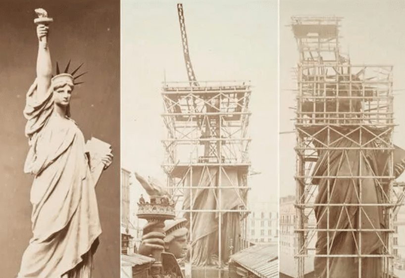 1880年,埃菲尔设计了一个巧妙的支撑系统:一个98英尺(29.87米)高的内部铁框架来支撑雕像的结构。