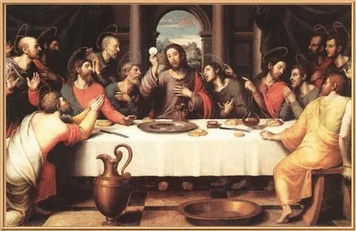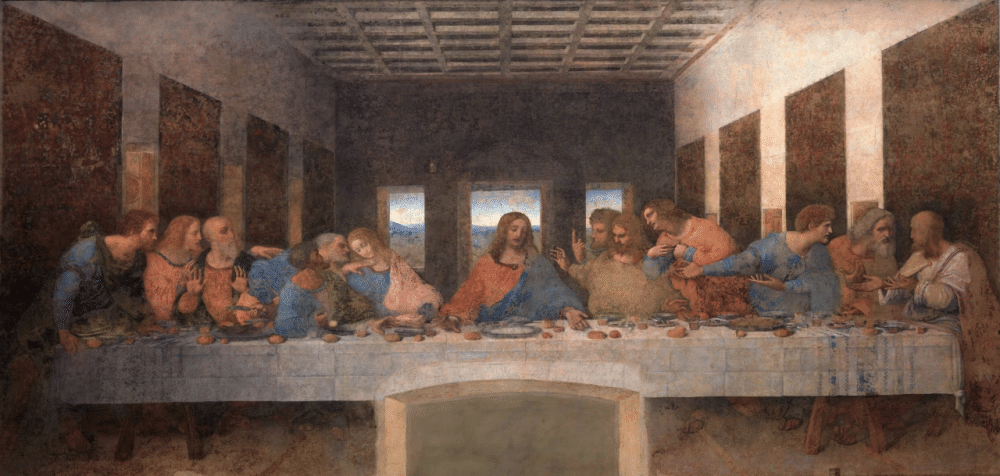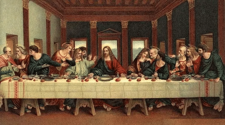 《最后的晚餐》是意大利艺术家达·芬奇所创作,以《圣经》中耶稣跟十二门徒共进最后一次晚餐为题材。画面中人物的惊恐、愤怒、怀疑、剖白等神态,以及手势、眼神和行为,都刻画得精细入微,惟妙惟肖,是所有以此题材创作的作品中最著名的一幅。收藏于意大利米兰圣玛利亚感恩教堂。