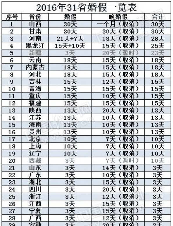 2016年,各省关于“晚婚假”的存废也已经尘埃落定。各地对原有的婚假、产假以及陪产假(即男士的护理假)均做出了相关的修改,从出台的规定来看,大多数省份的婚假都是在取消晚婚晚育、规定延长生育假的大原则之下,绝大多数省份的婚假天数是与国家法律规定保持一致的。29个省取消了原有的晚婚假,其中有11个省份删除了相关晚婚假的条例,并没有对婚假再做另外的相关规定,那么这些省份婚假将与国家法律规定保持一致,仅有三天法定婚假,这些省份包括广东、湖北、四川、浙江、江西、宁夏、广西、安徽、湖南、天津、山东。而山西、甘肃则保留30天豪华婚假。