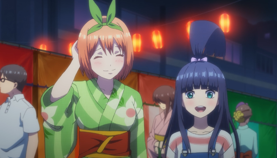 到了酒店之后,二乃因为风太郎也在跟自己一个房间住的关系而集合了五胞胎,吃过饭、确认过行程后五胞胎也开始泡温泉浴。因为确认不了到底谁睡在风太郎旁边,所以五个人都一起睡在他旁边。