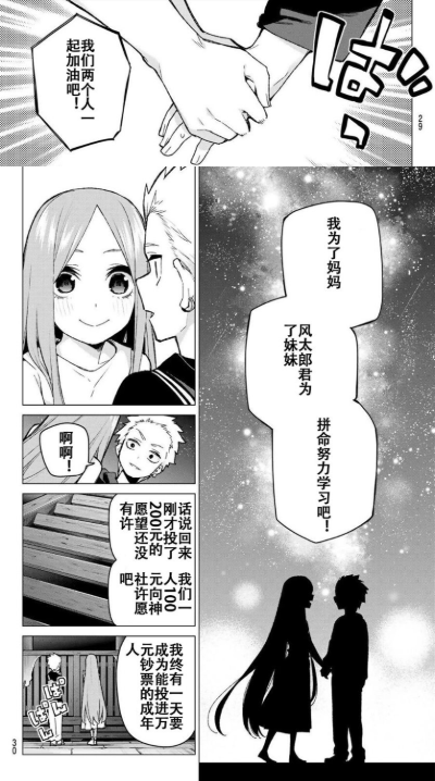 过了几天,风太郎再次来到拜访、打算给他们补习的时候五胞胎刚刚起床。收拾干净后告知风太郎寒假作业已经全部写完。