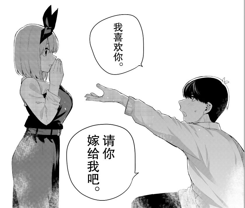 四叶诧异的时候问风太郎“为什么在这里,是不是受伤了”,风太郎否认,并称自己来这里就是为了找四叶,还带了四叶送自己免费券换的炸鸡块来跟四叶一块吃。风太郎正准备说出自己选择四叶的话的时候立马就被四叶拒绝,并称风太郎跟着自己未免太过浪费,觉得自己配不上风太郎,风太郎让她说出自己的想法后四叶逃跑。风太郎追上后抓住了四叶的脚踝让她逃不掉后告白“我是个软弱的人,今后也会一直受挫吧。这只是我个人任性的愿望,那时候只要四叶你在我身边我就很高兴了。你是我的支柱,我也想成为你的支柱。哪怕讨厌也好,请让我听听你的心意”,四叶想说出自己最讨厌风太郎,但终究无法欺骗自己与风太郎,对风太郎袒露了自己的心声:“我一直都喜欢你。”但随后四叶称自己还有非做不可的事情离开。