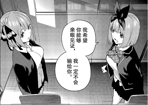 受到一花鼓励后的四叶见到风太郎无法进行正常的对话,逃避后被风太郎追上,风太郎让四叶跟着自己去打听去年的摊位情报。在班上罗列出受欢迎的项目后因为迟迟都不能决定摆摊的内容班上同学都分成了男女两派。