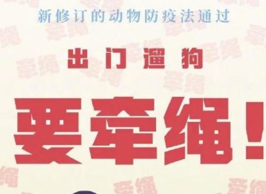 新《动物防疫法》规定:出门遛狗要牵绳,新华社消息,全国人大常委会会议1月22日表决通过新修订的《动物防疫法》。新法规定,携带犬只出户,应当按照规定佩戴犬牌并采取系犬绳等措施,防止犬只伤人、疫病传播。