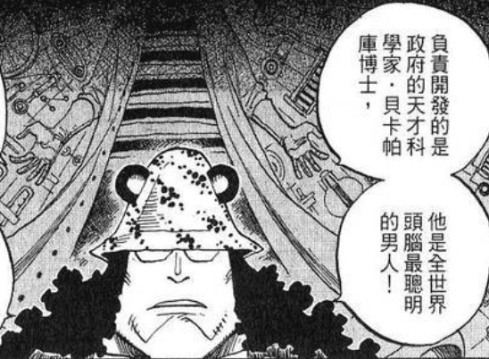 非常神秘的科学家。至今为止仍然未在漫画中现身,但是他的影响无处不在,也是唯一一个彻底了解恶魔果实的男人。他被人们称为超越人类智慧500年的科学家,世界政府第一号科学家,号称拥有超越现代五百年的科技能力,从恶魔果实到机械制造,无所不精通,是真正的天才科学家。虽然凯撒·克朗老是想和他一争高低,但是根本无法企及贝加庞克的高度。