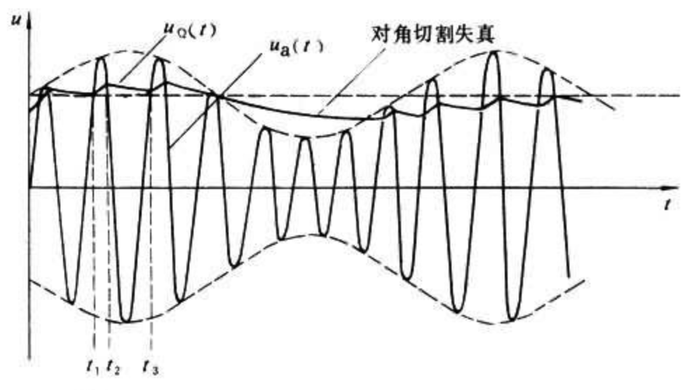 只要RLC选择恰当,就可在负载RLC上得到与输入信号包络成对应关系的输出电压u(t)。如果时间常数RLC太大,放电速度就会放慢,当输入信号包络下降时,u(t)可能始终大于ua(t),造成所谓对角切割失真(图2)。此外,检波器的输出通常通过电容、电阻耦合电路加到下一级放大器,如图1中虚线所示。如果Rg太小,则检波后的输出电压u(t)的底部即被切掉,产生所谓的底部切割失真。