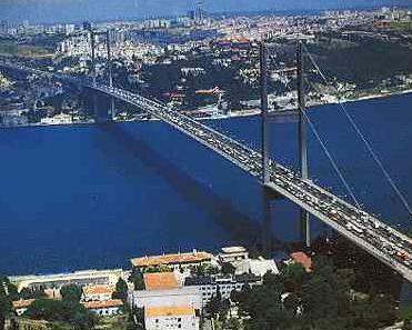 伊斯坦布尔位于博斯普鲁斯海峡两岸。窄窄的海峡把全市一分为二:海峡西岸属欧洲,东岸则属亚洲。两岸之间,一座长达1560米的现代化网索大吊桥雄踞海面。它建于1973年,是欧洲第一大吊桥,世界第四大吊桥。桥上可并行6辆汽车,每天通过大桥的车辆达10万辆。大桥正中,醒目地画着一条白线,这便是欧、亚两洲分界的标志。凡是到伊斯坦布尔来旅游的人,都想乘车通过一次大桥,看看这条分界线,体验一下洲际旅行的乐趣。1988年,在离这座大桥8海里的地方,又架起了第二座博斯普鲁斯海峡大桥,更便于欧亚两洲人民的交往。